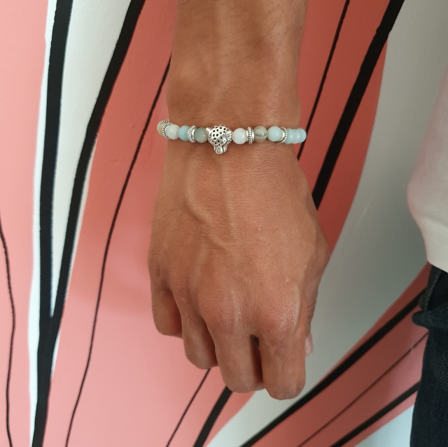 Ce bracelet est entièrement réalisé à la main en pierres naturelles d’amazonite de 6 mm de diamètre. Le charm léopard et les intercalaires sont en alliage de zinc argenté.