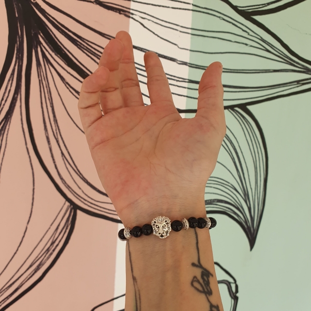 Ce bracelet est entièrement réalisé à la main en pierres naturelles d’agate noire de 6 mm de diamètre. Le charm lion et les intercalaires sont en alliage de zinc argenté.