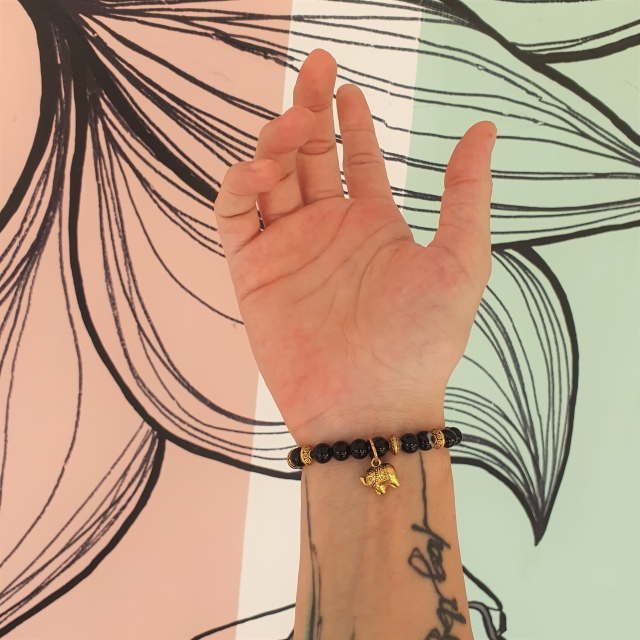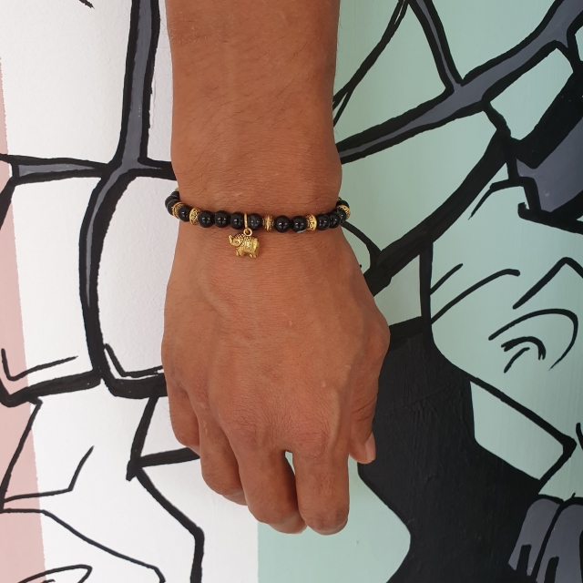 Bracelet MIXTE "Courage & Calme" en agate noire - Charm éléphant doré