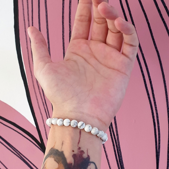 Ce bracelet est entièrement réalisé à la main en pierres naturelles d’howlite de 6 mm de diamètre.