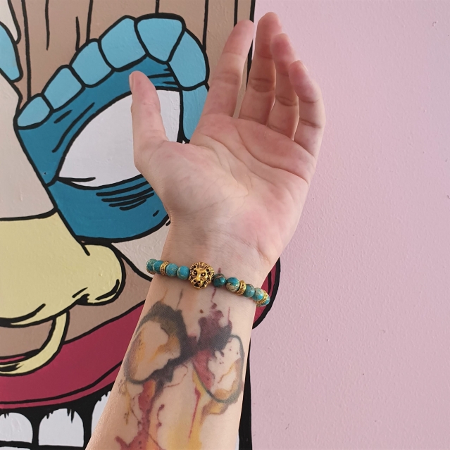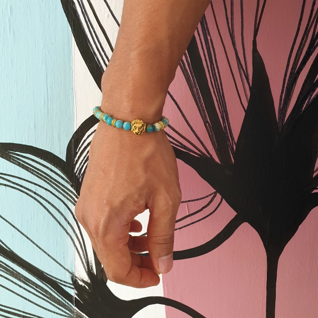 Ce bracelet est entièrement réalisé à la main en pierres naturelles de jaspe bleu de 6 mm de diamètre. Le charm lion et les intercalaires sont en alliage de zinc doré.