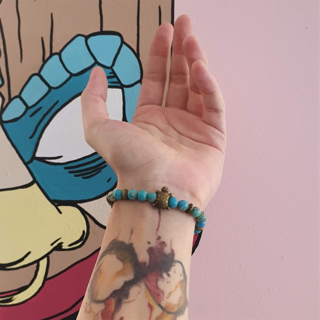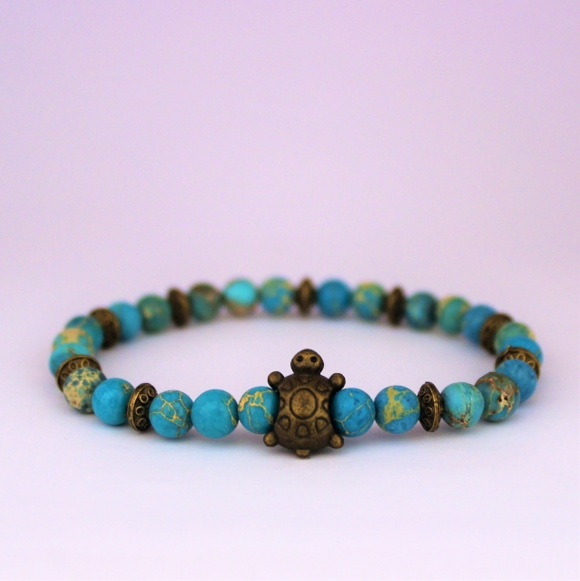 Ce bracelet est entièrement réalisé à la main en pierres naturelles de jaspe bleu de 6 mm de diamètre. Le charm tortue et les intercalaires sont en alliage de zinc de couleur bronze.