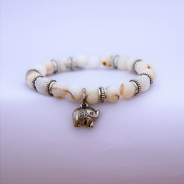 Ce bracelet entièrement réalisé à la main est fait de perle en coquillage naturel de 7 mm de diamètre. Le charm éléphant et les intercalaires sont en alliage de zinc argenté.