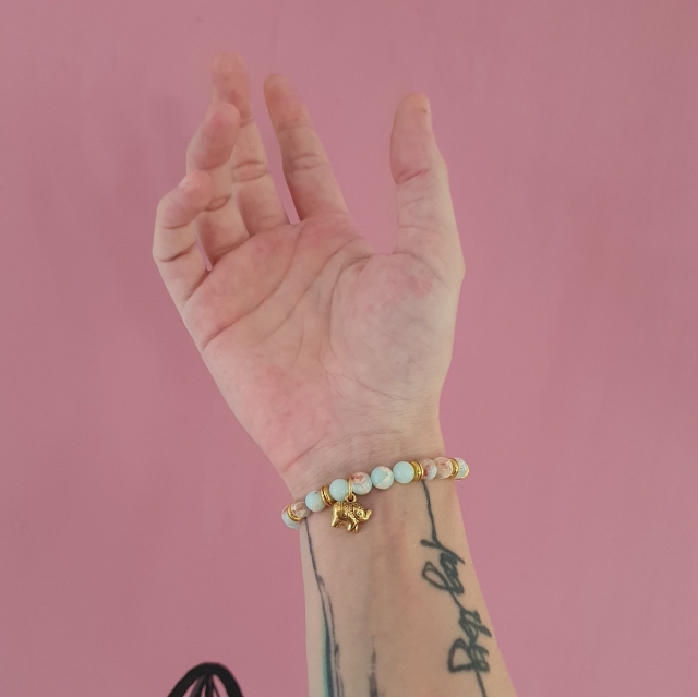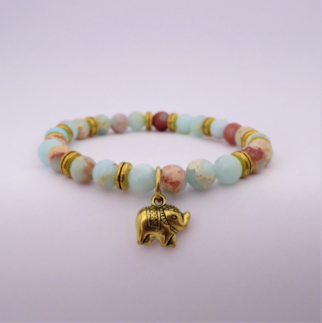 Ce bracelet est entièrement réalisé à la main en pierres naturelles de jaspe impérial de 6 mm de diamètre. Le charm éléphant et les intercalaires sont en alliage de zinc doré.