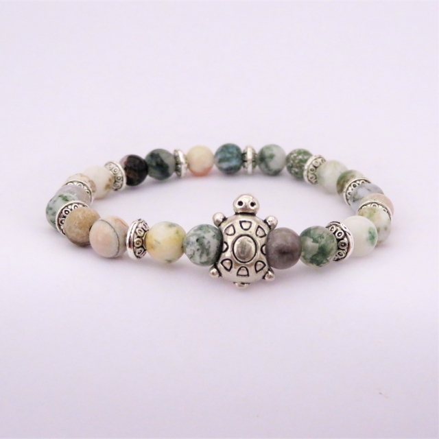 Ce bracelet est entièrement réalisé à la main en pierres naturelles d’agate mousse de 6 mm de diamètre. Le charm tortue est en acier inoxydable et les intercalaires sont en alliage de zinc argenté.
