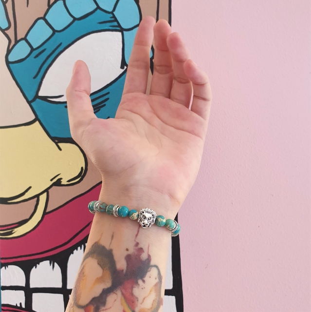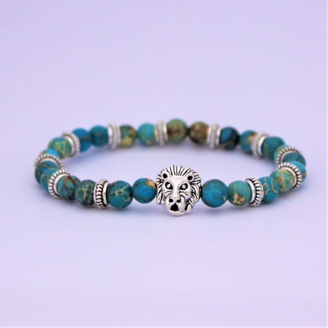 Ce bracelet est entièrement réalisé à la main en pierres naturelles de jaspe bleu de 6 mm de diamètre. Le charm lion et les intercalaires sont en alliage de zinc argenté.