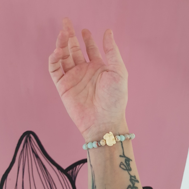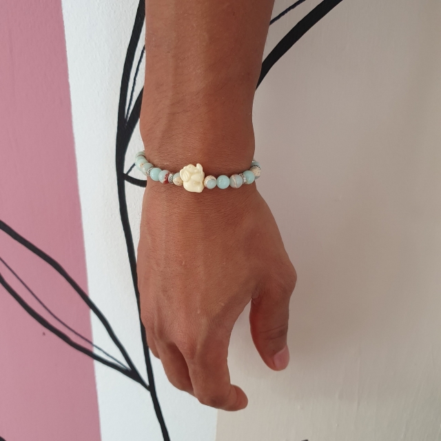 Ce bracelet est entièrement réalisé à la main en pierres naturelles de jaspe impérial de 6 mm de diamètre. Le charm éléphant est en résine et les intercalaires sont en acier inoxydable.