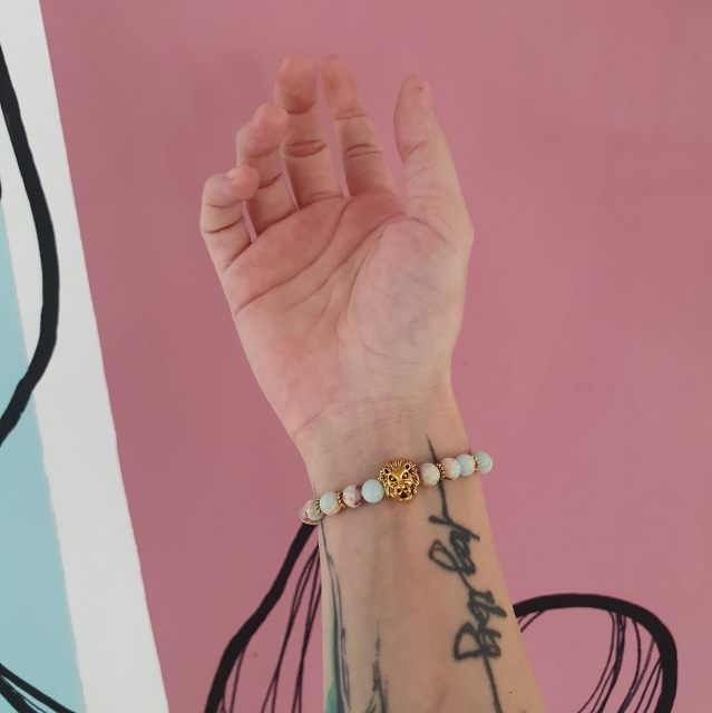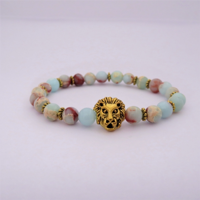 Ce bracelet est entièrement réalisé à la main en pierres naturelles de jaspe impérial de 6 mm de diamètre. Le charm lion et les intercalaires sont en alliage de zinc doré.