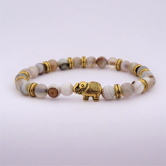Ce bracelet est entièrement réalisé à la main en pierres naturelles d’agate grise de 6 mm de diamètre. Le charm éléphant et les intercalaires sont en alliage de zinc doré.