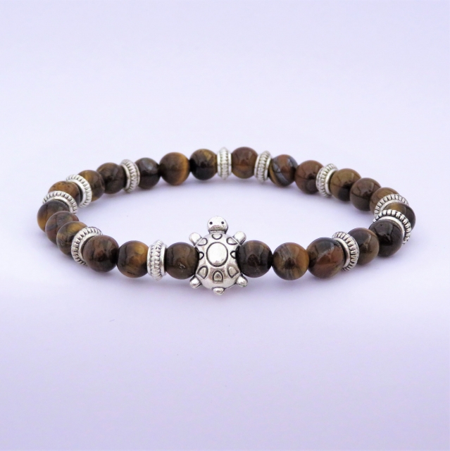 Ce bracelet est entièrement réalisé à la main en pierres naturelles d’œil de tigre de 6 mm de diamètre. Le charm tortue est en acier inoxydable et les intercalaires sont en alliage de zinc argenté.