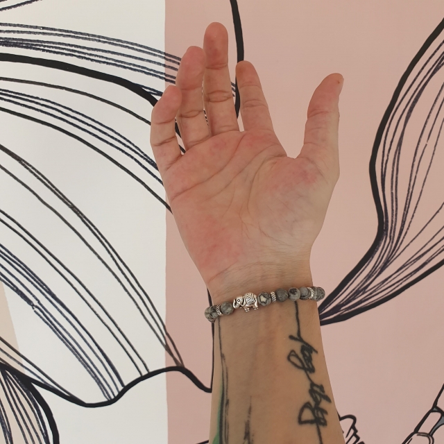 Ce bracelet est entièrement réalisé à la main en pierres naturelles de jaspe gris de 6 mm de diamètre. Le charm éléphant est en alliage de zinc argenté et les intercalaires sont en acier inoxydable.