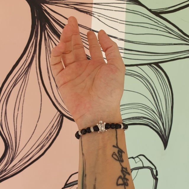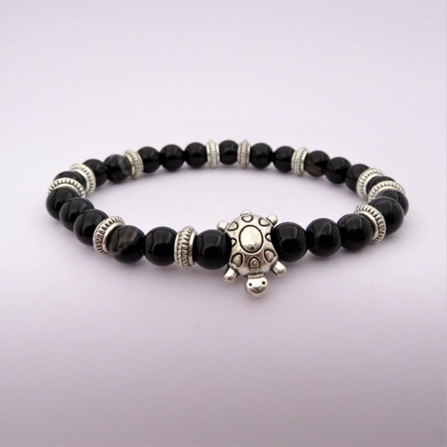 Bracelet "Courage & Calme" en agate noire - Tortue argentée